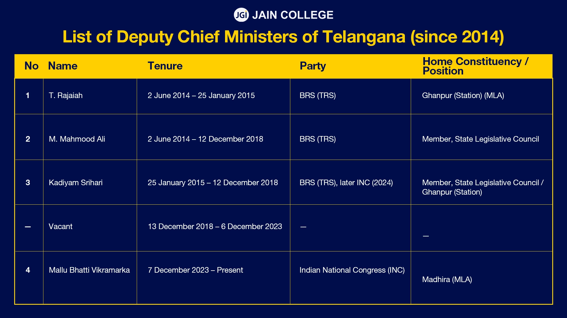 4 | Mallu Bhatti Vikramarka | 7 December 2023 – Present | Indian National Congress (INC) | Madhira (MLA) |